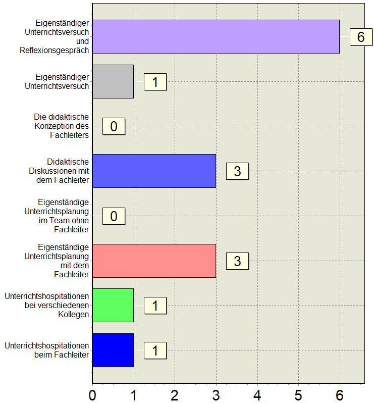 Die Teilnahme an den UBs mit anschließendem Reflexionsgespräch. Die Unterrichtsbesuche bei Referendaren. Die Reflexionsgespräche, die Organisation Die Möglichkeit verschiedene UB‘s sowie die Fachseminare besuchen zu können. Besuch der UBs!!! Der Besuch im Seminar war mir sehr wichtig um schonmal ein besseres Bild vom Referendariat zu bekommen. Der lockere und kollegiale Umgang und die konstruktive Kritik bzw. Nachbesprechungen. Die Reflexionsgespräche haben mich sehr voran gebracht und waren hilfreich diese von anderen Praktikanten mitzubekommen. Besonders hat mir das gute Arbeitsklima gefallen.